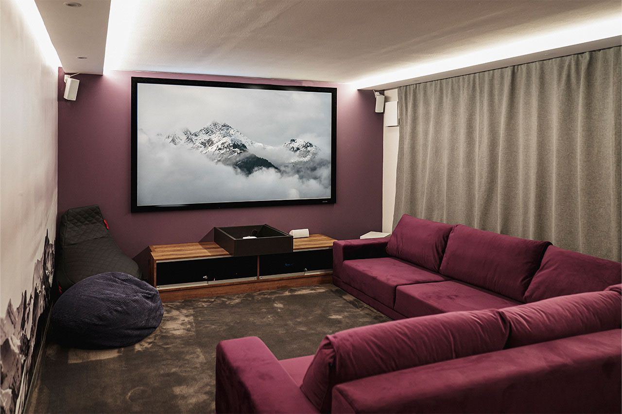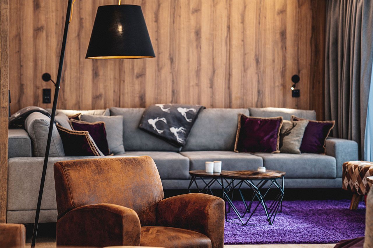 a living room with a large sectional couch and a purple rug .