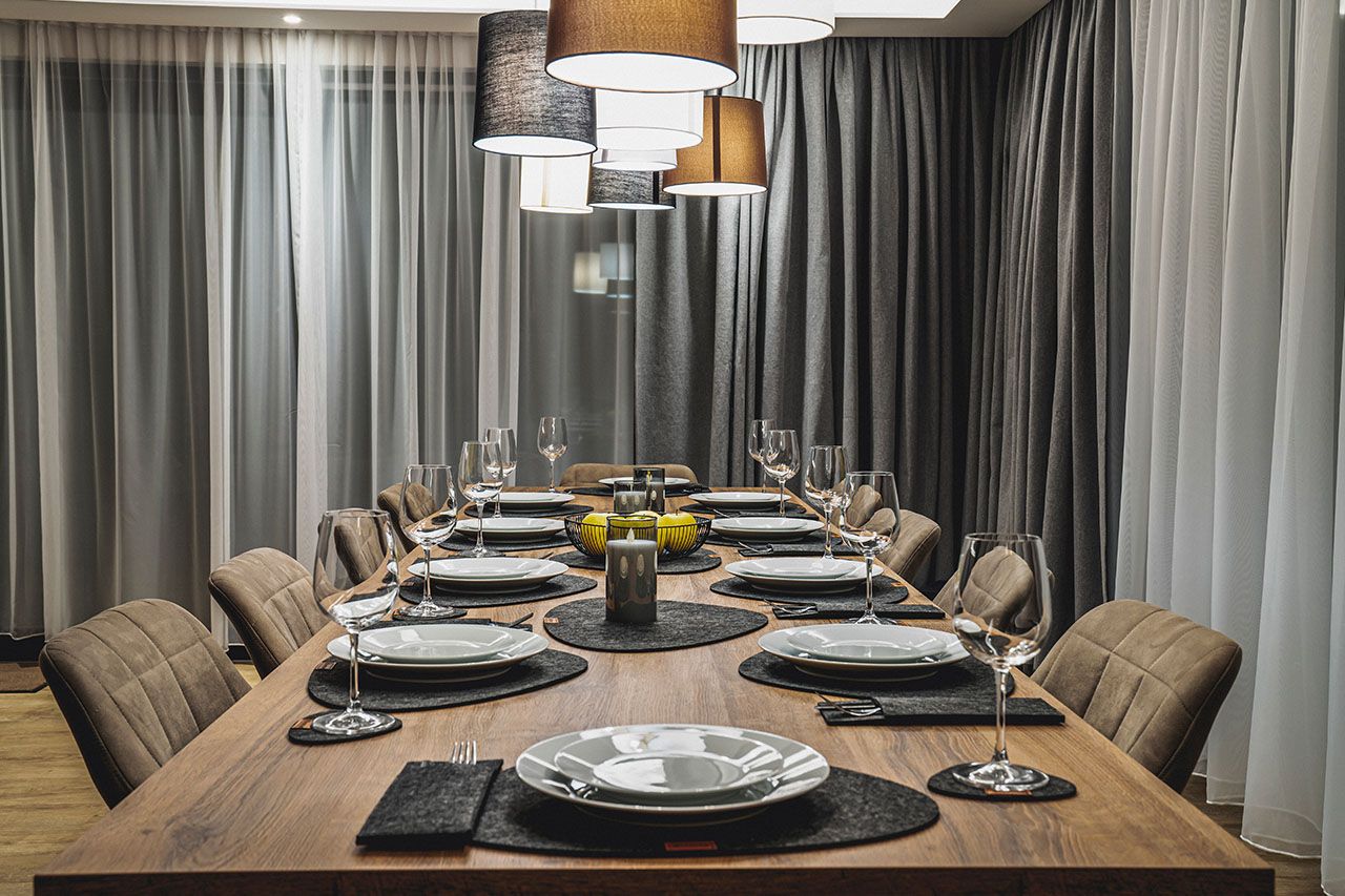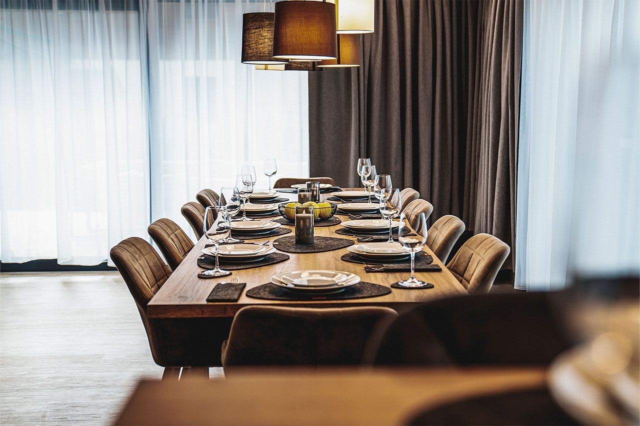 a dining room with a long table and chairs .