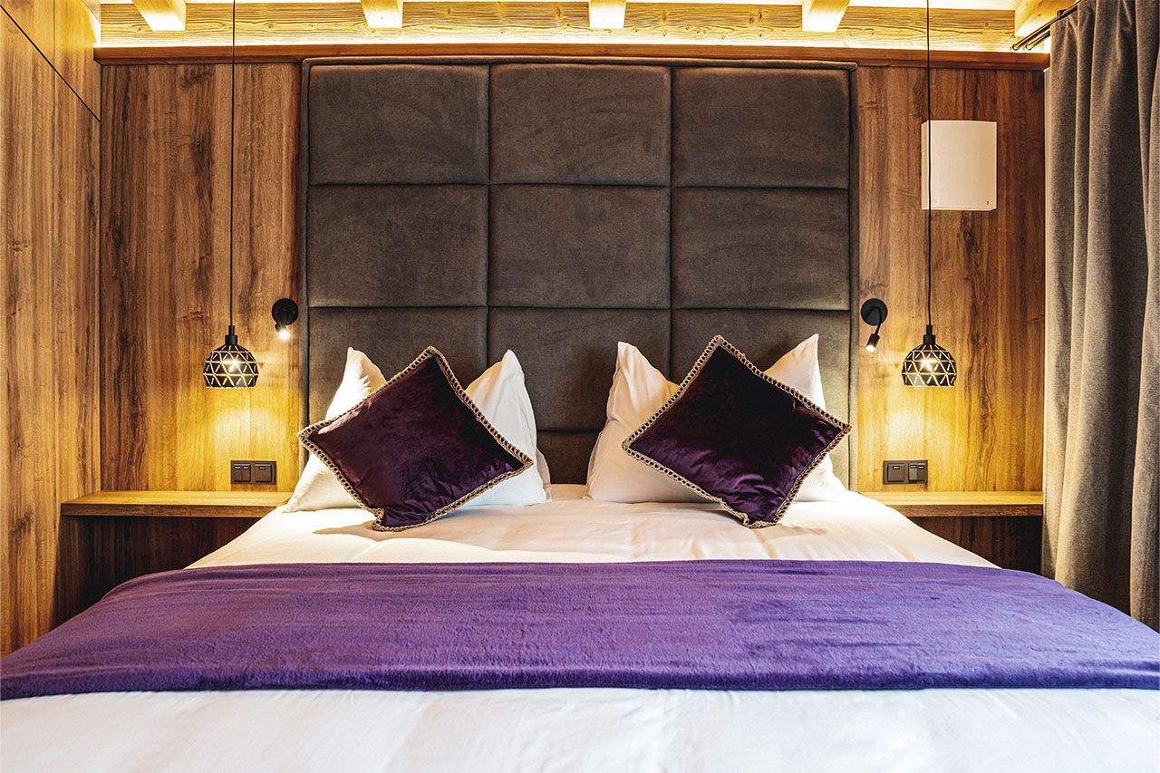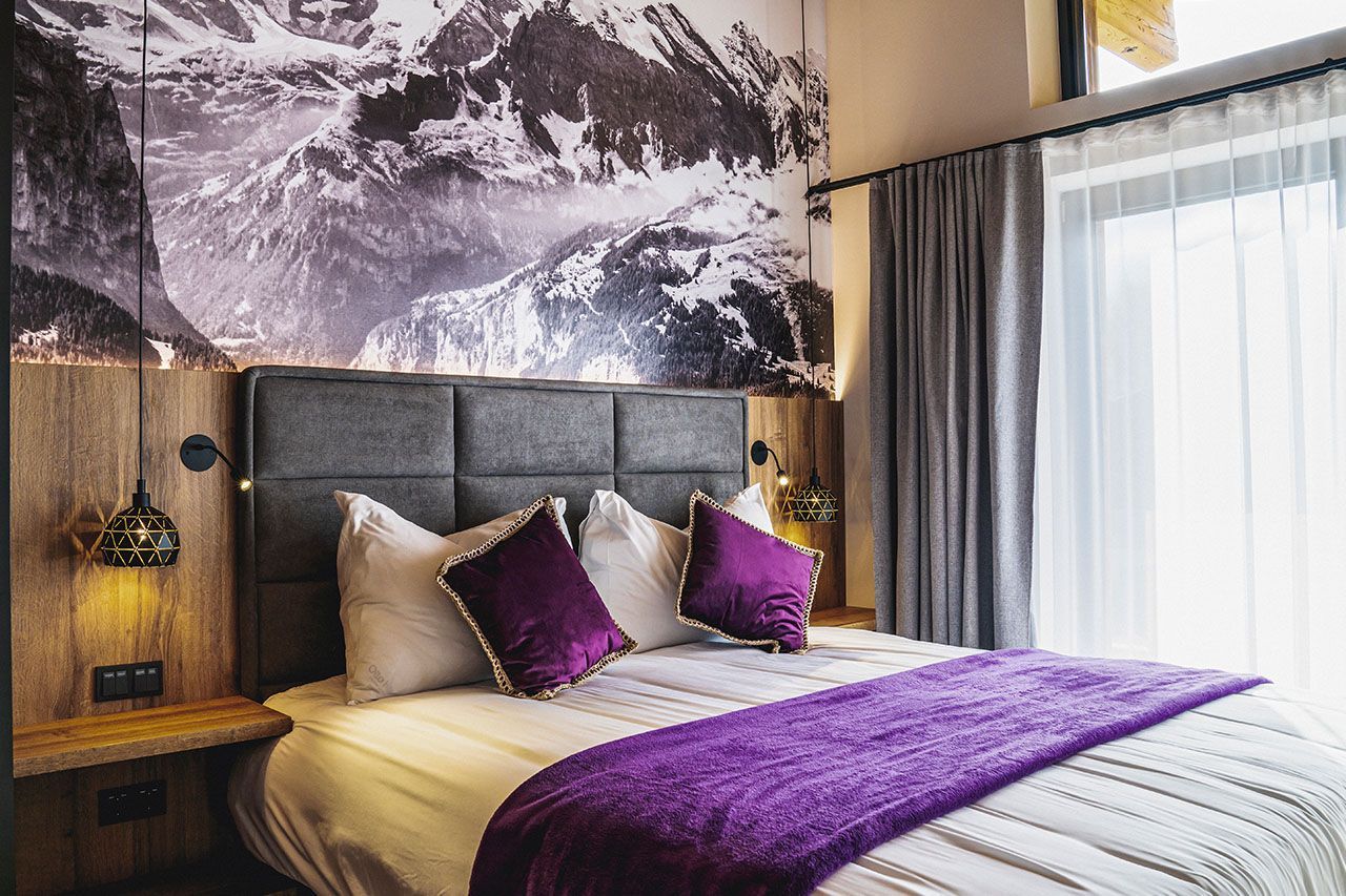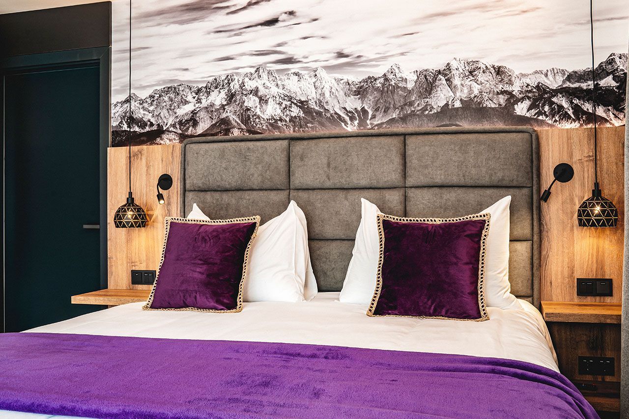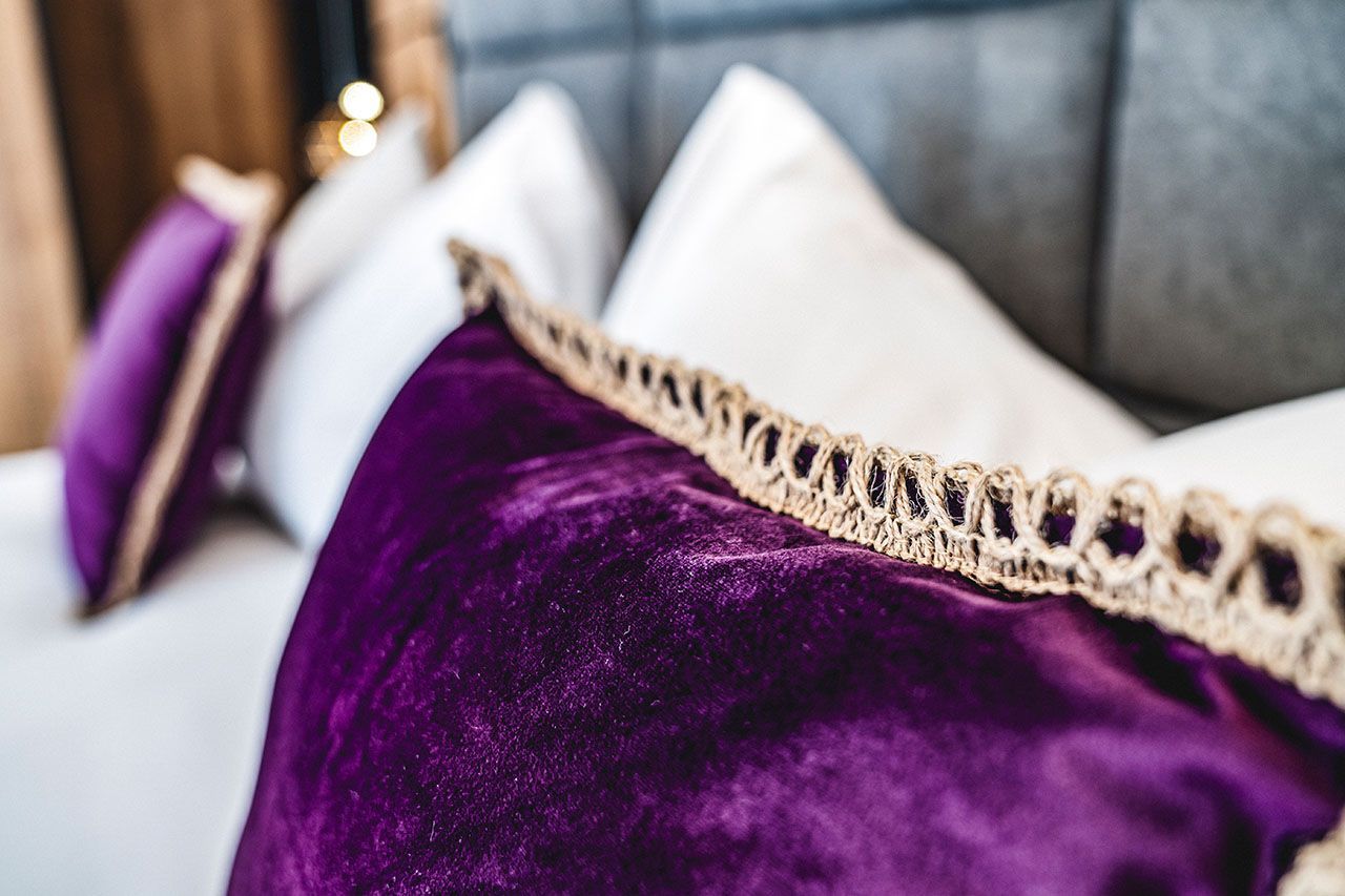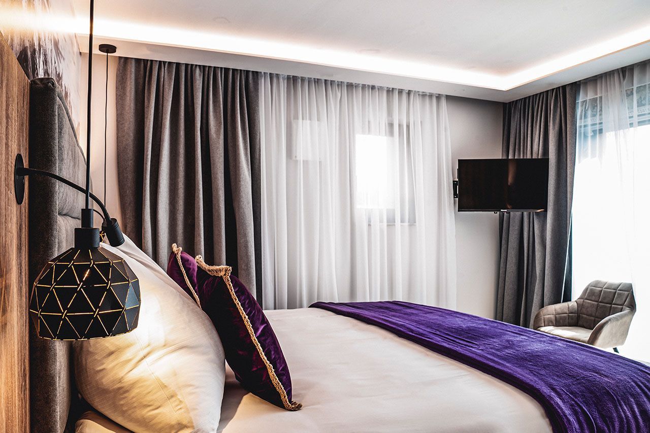 a bed with purple pillows and a purple blanket in a hotel room .