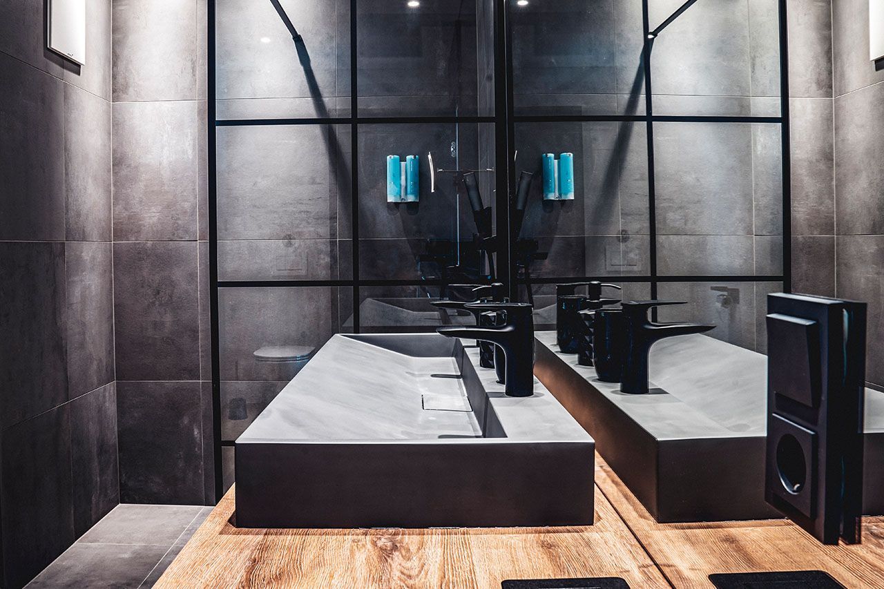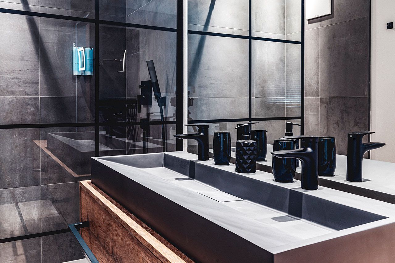 a kitchen with black cabinets and wooden counter tops