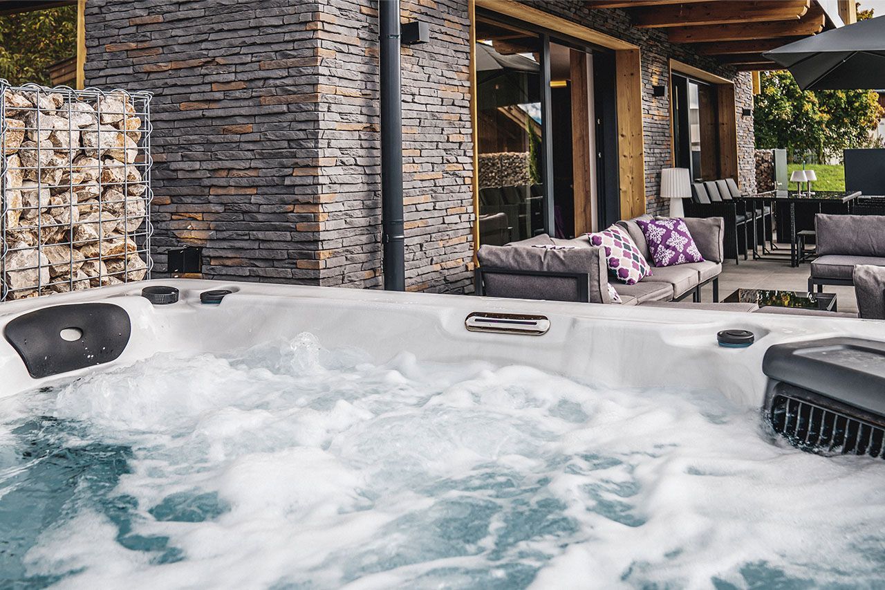 a large wooden house with a hot tub in front of it .