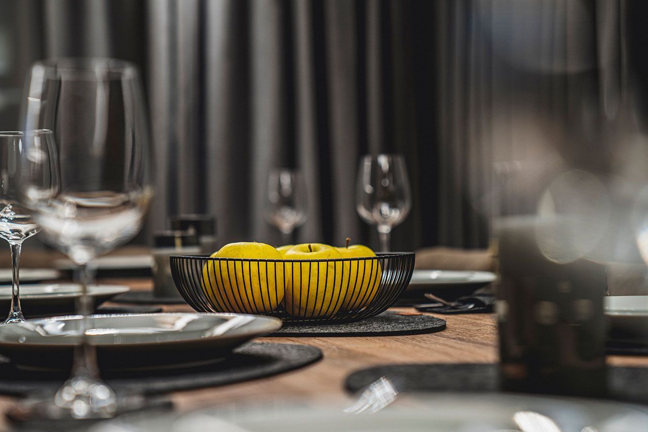 a long wooden dining table with plates and glasses on it in a room