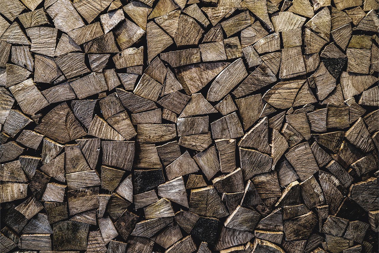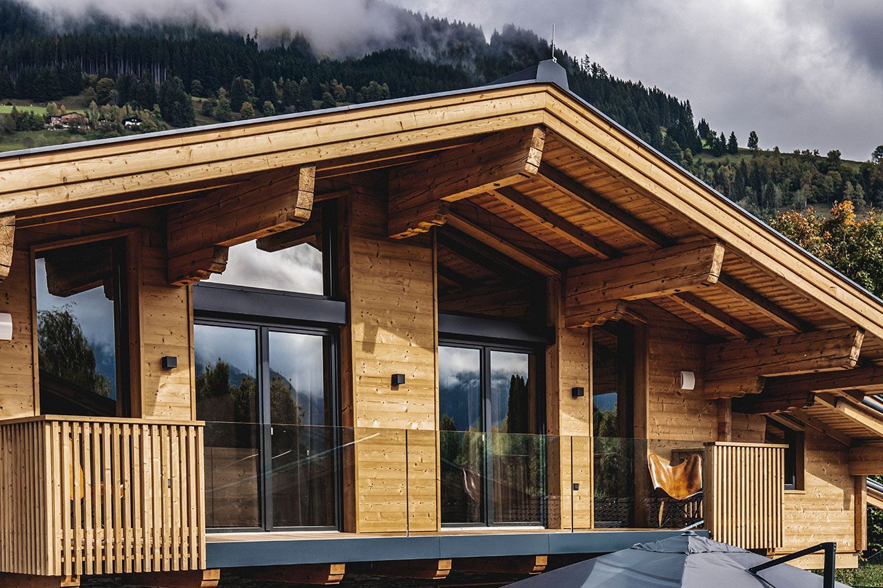 a large wooden house with mountains in the background