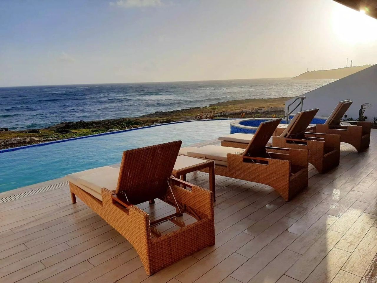 a view of the ocean from a balcony with a swimming pool in the foreground .