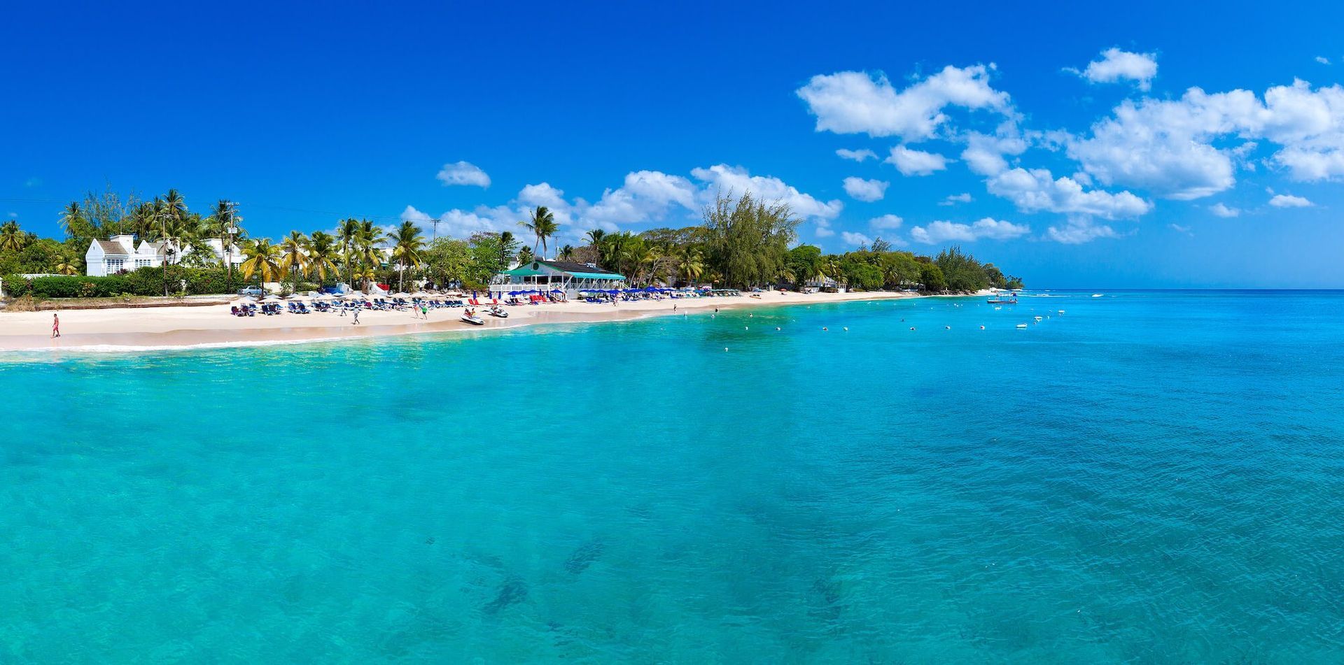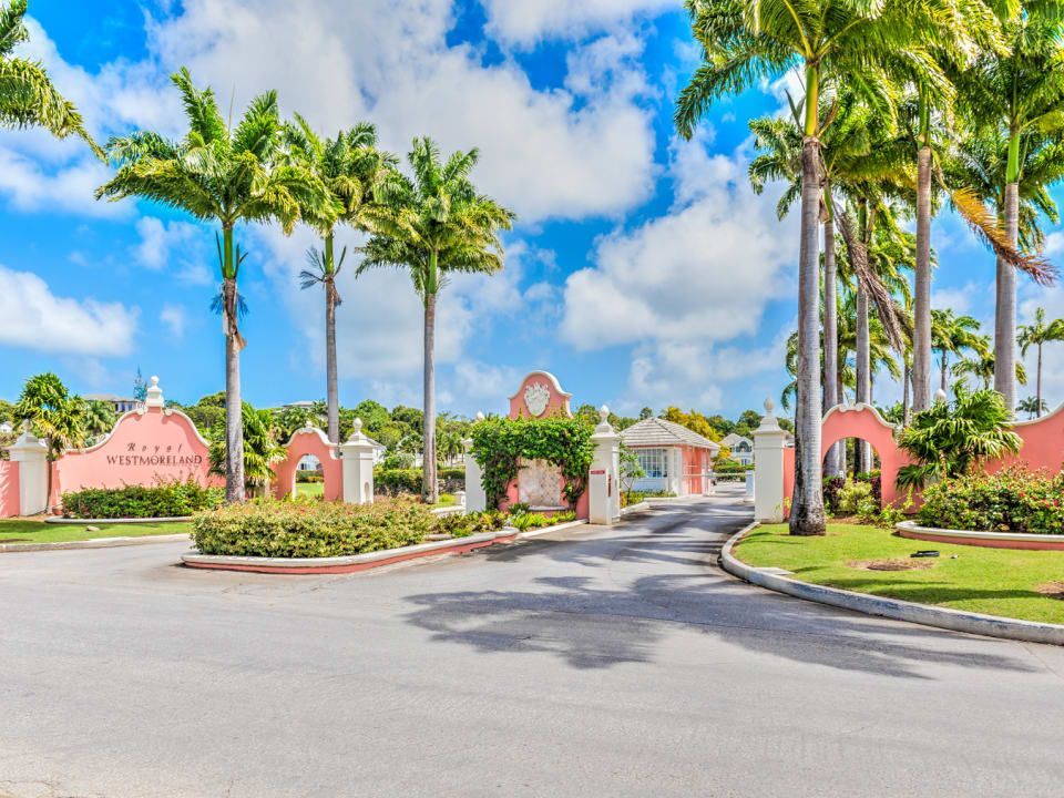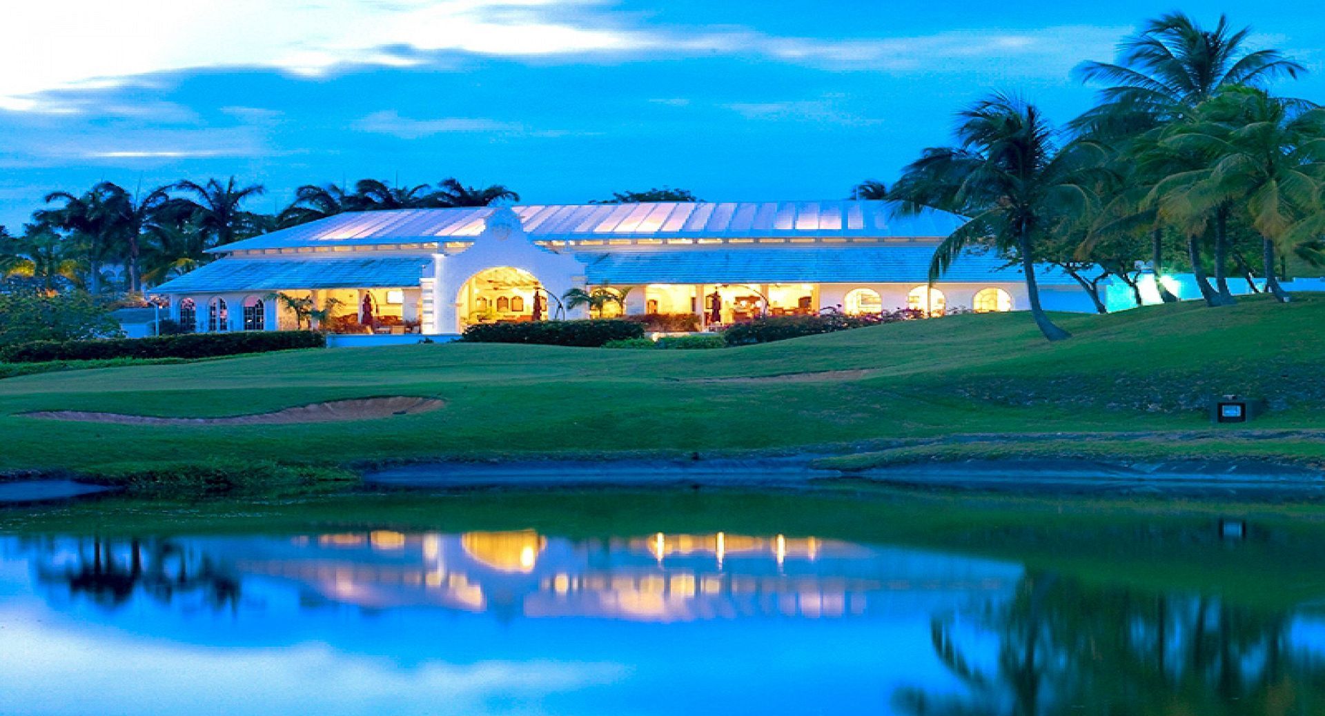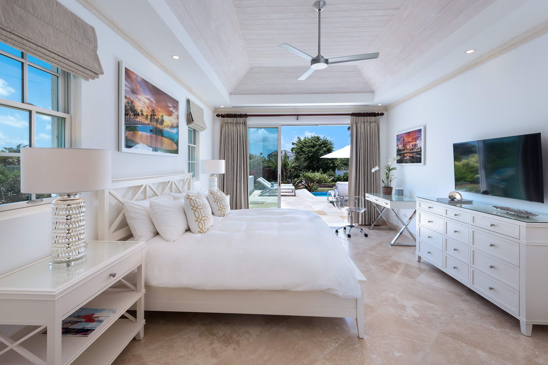 a patio with white furniture and umbrellas overlooking a swimming pool