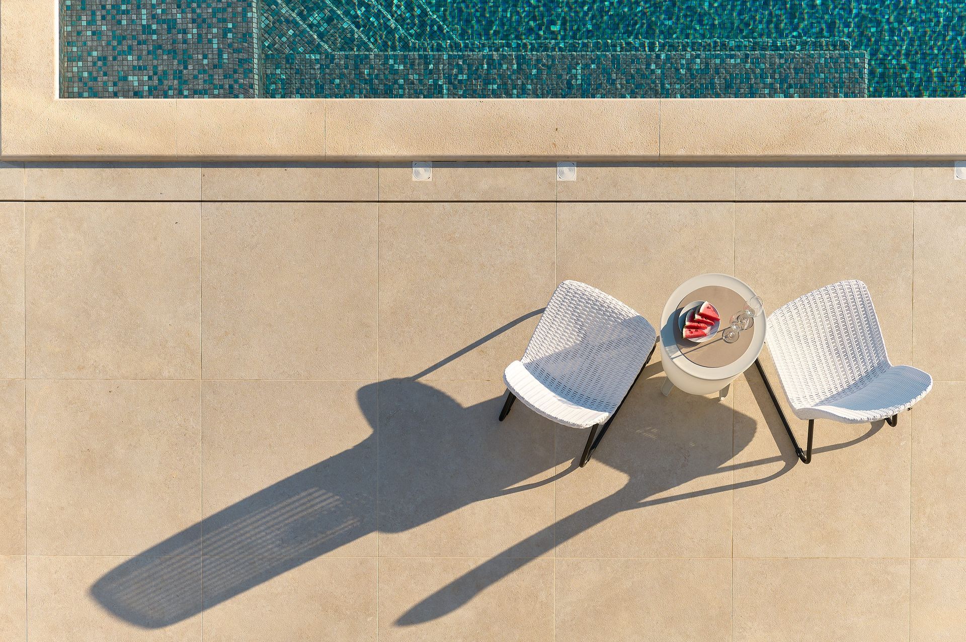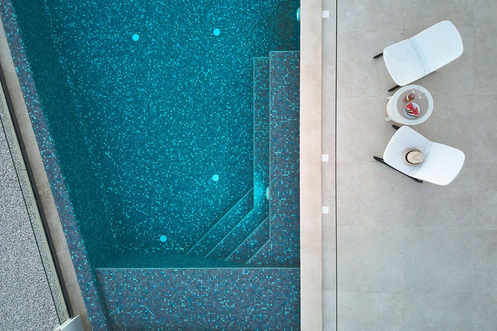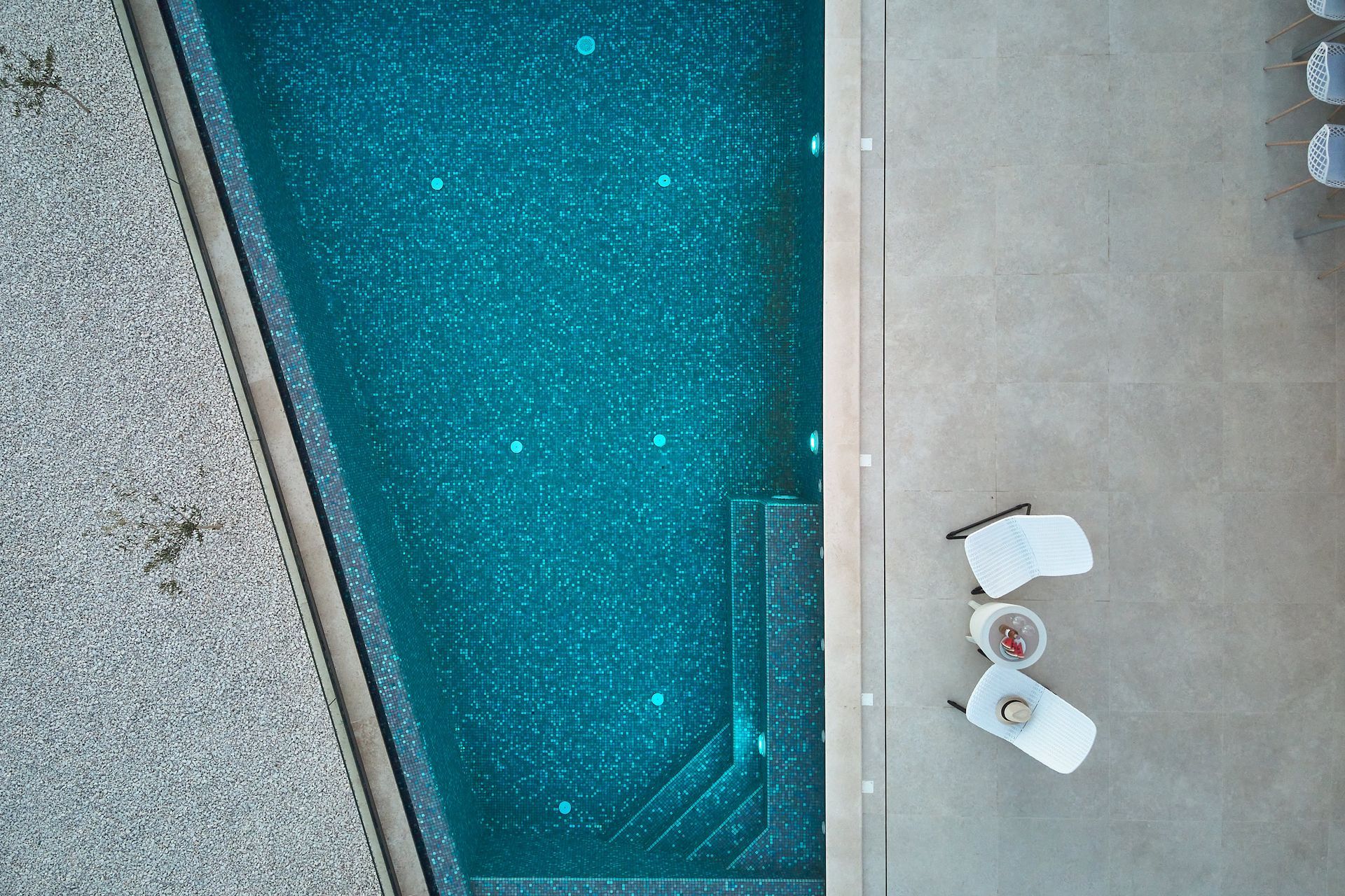 an aerial view of a large swimming pool with chairs and a table .