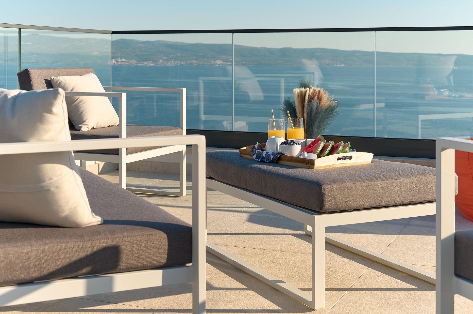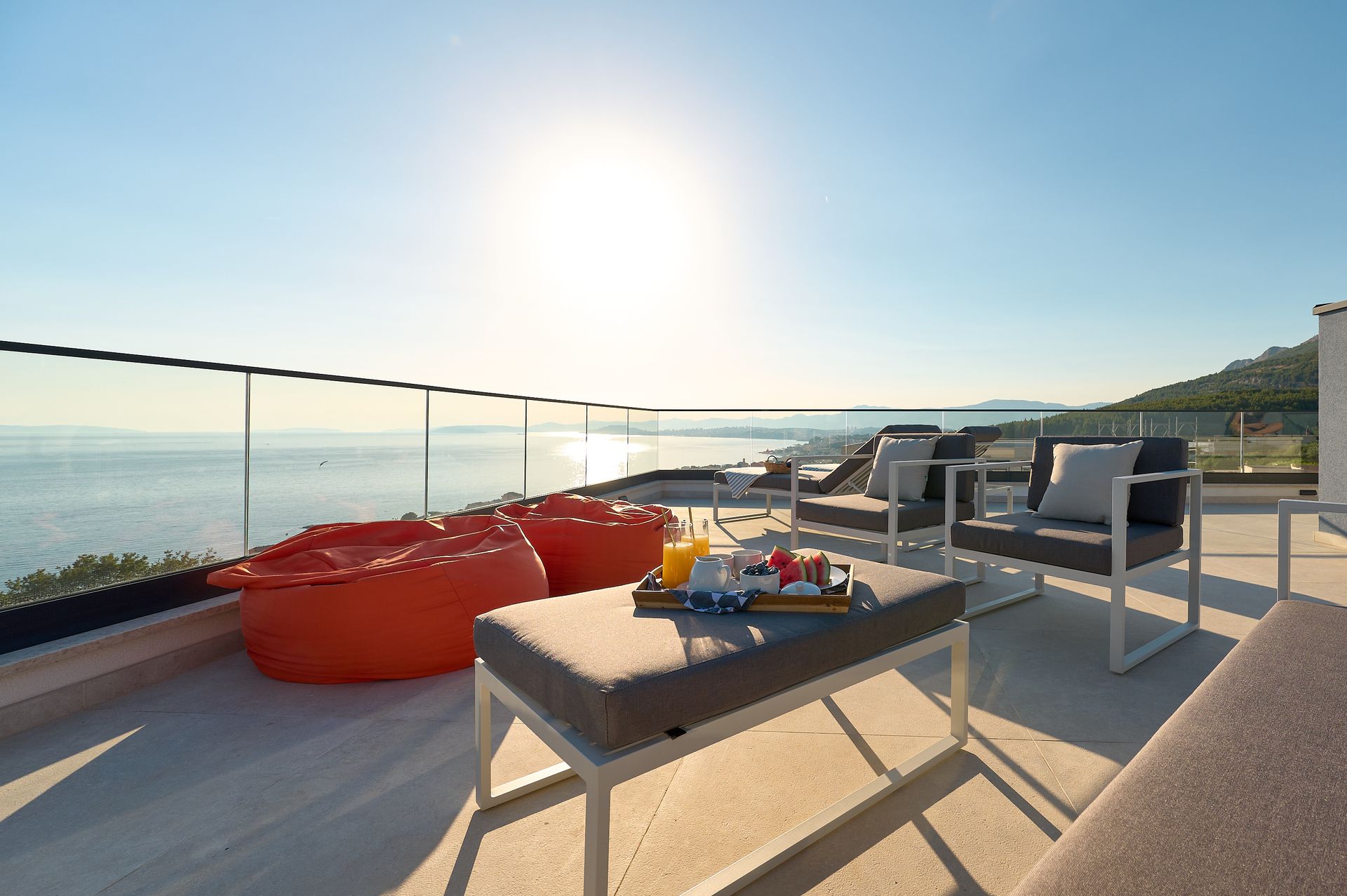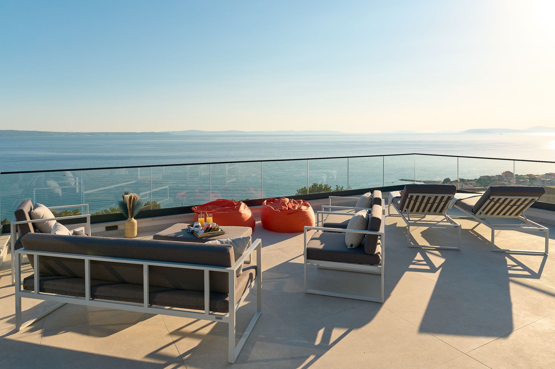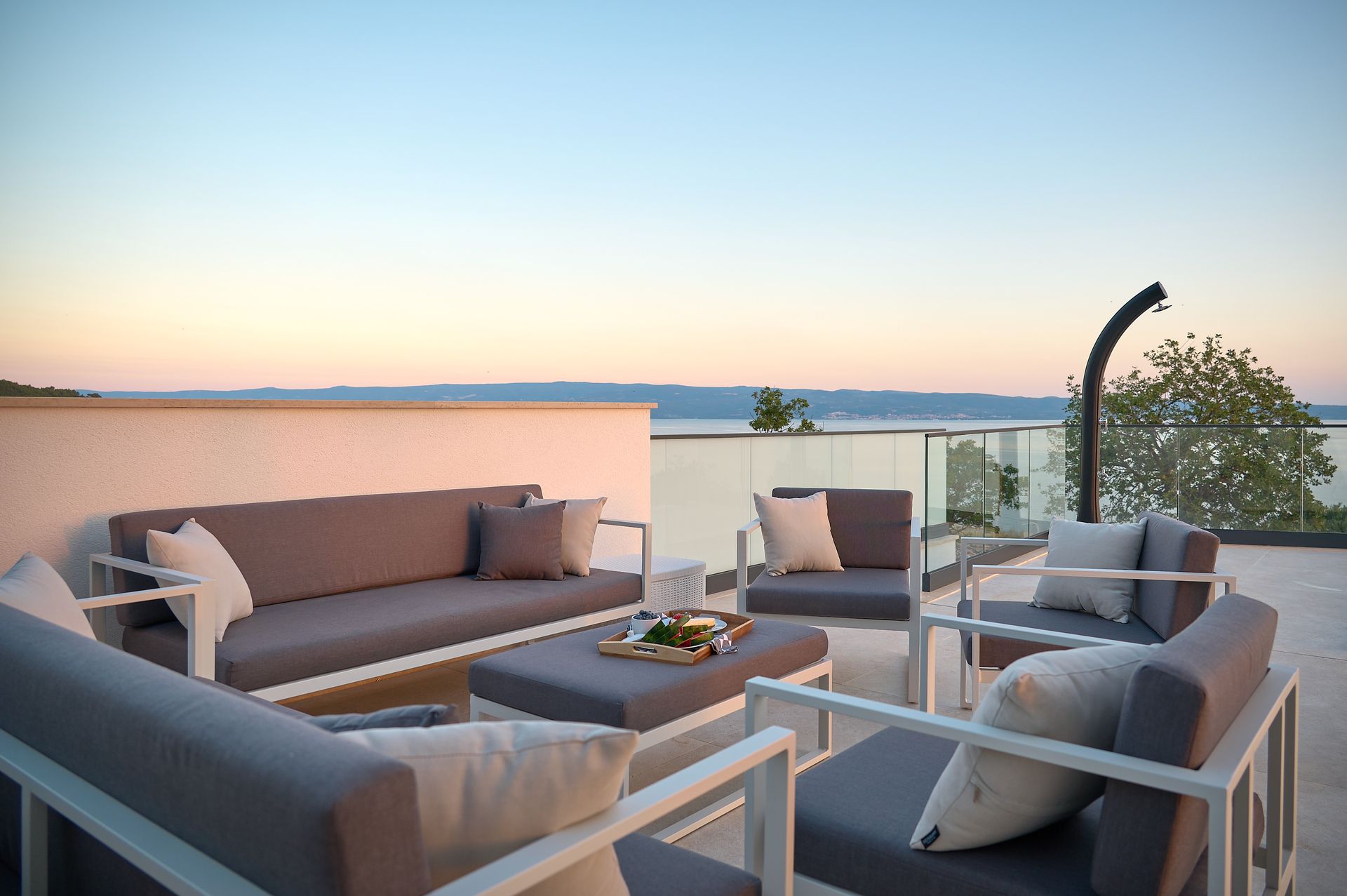 a patio with a view of the ocean and a couch and chairs .