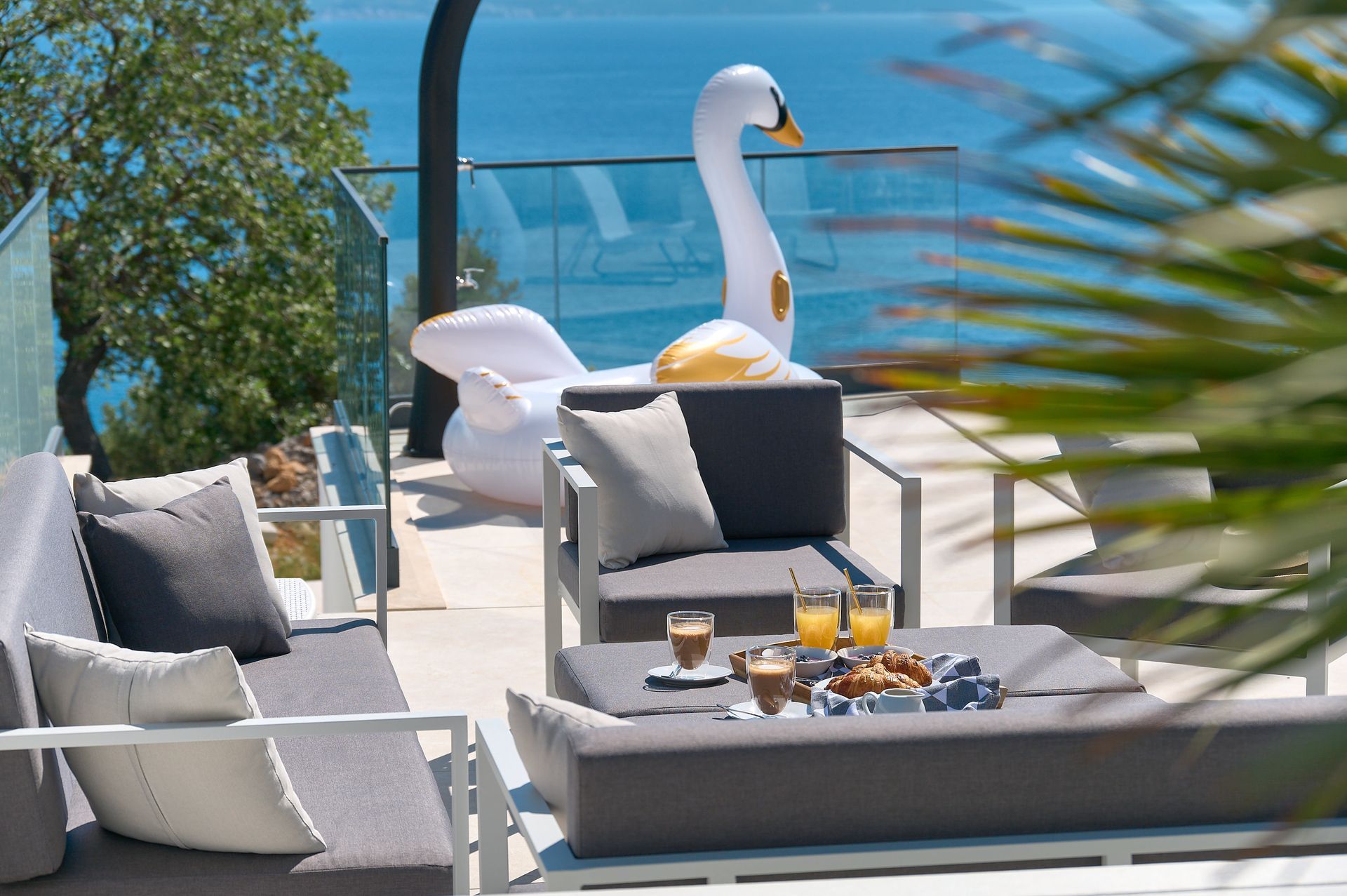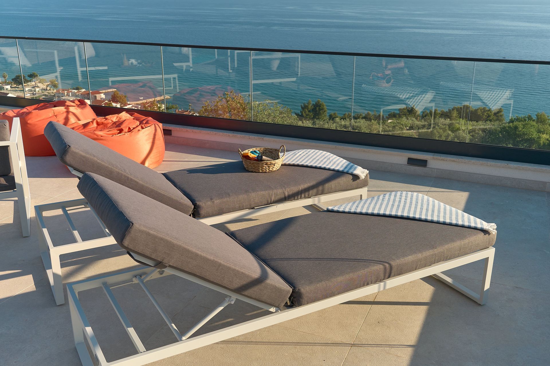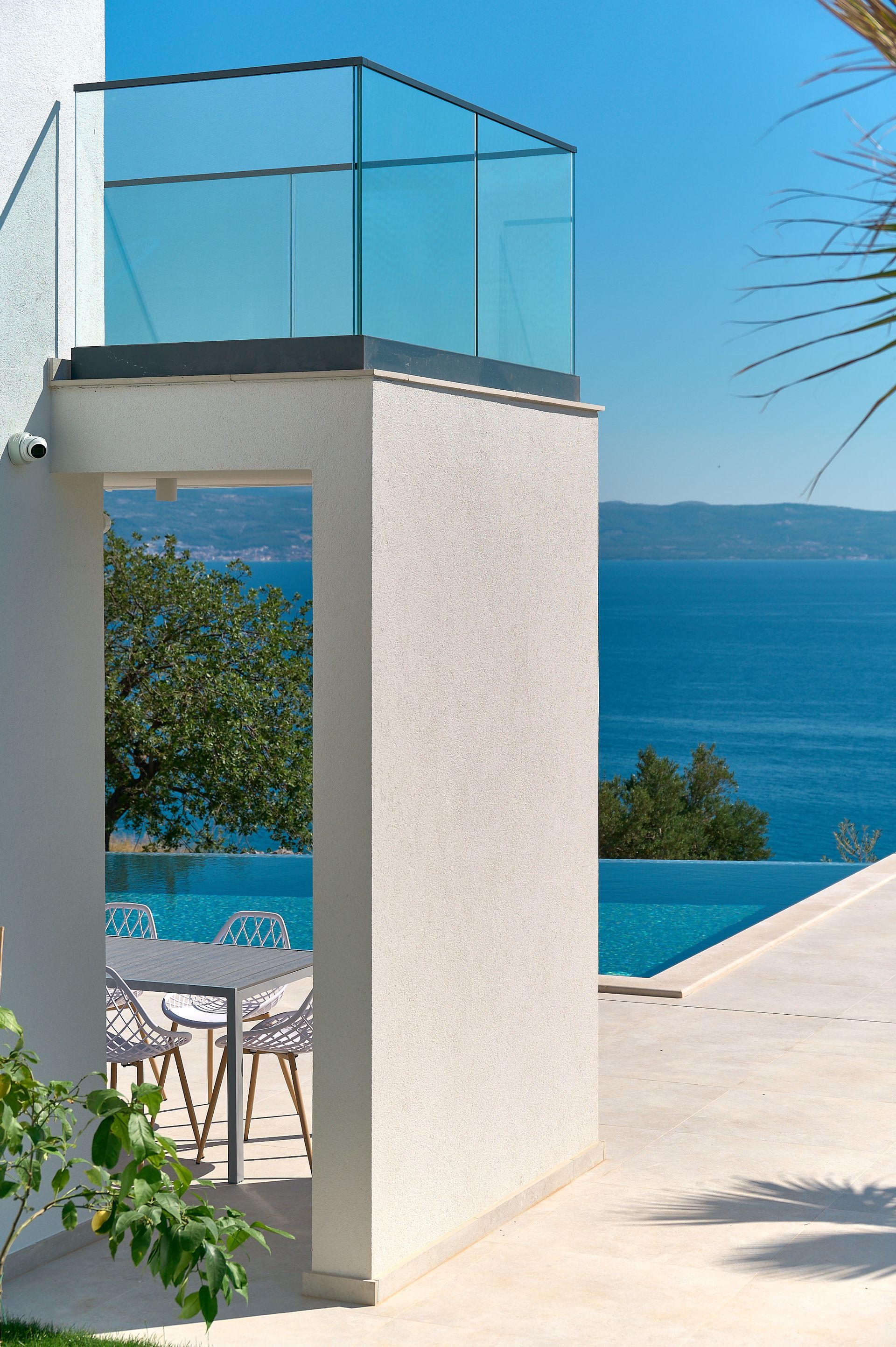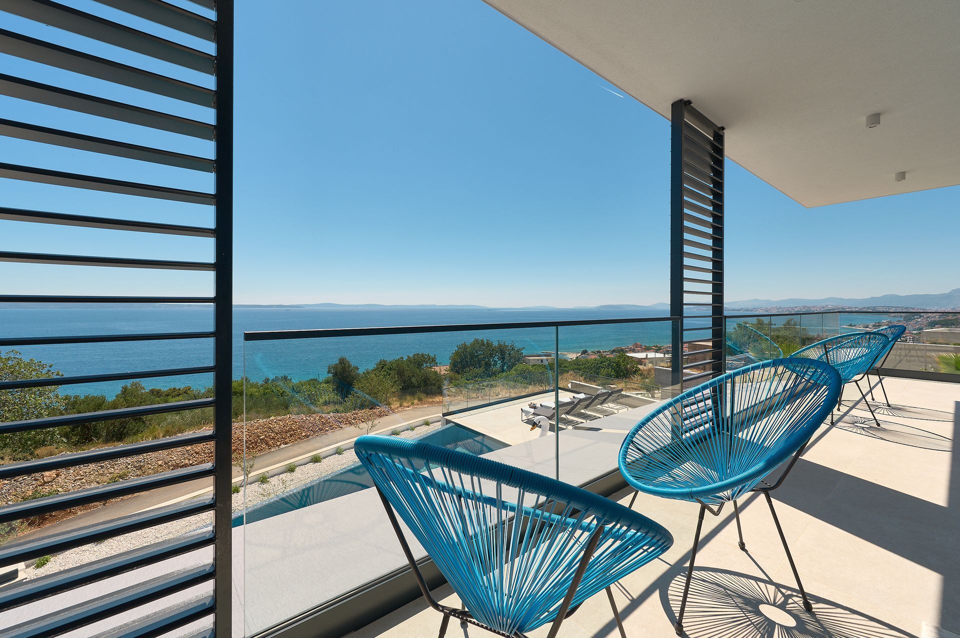 a patio with a view of the ocean and a couch and chairs .