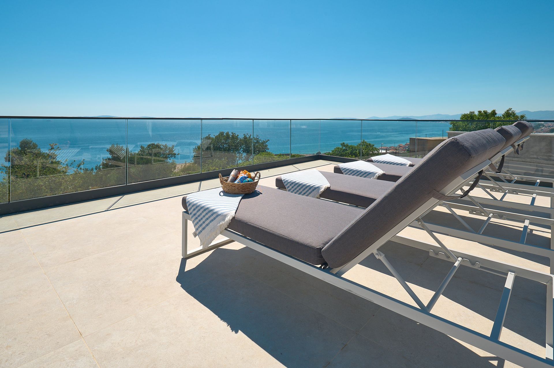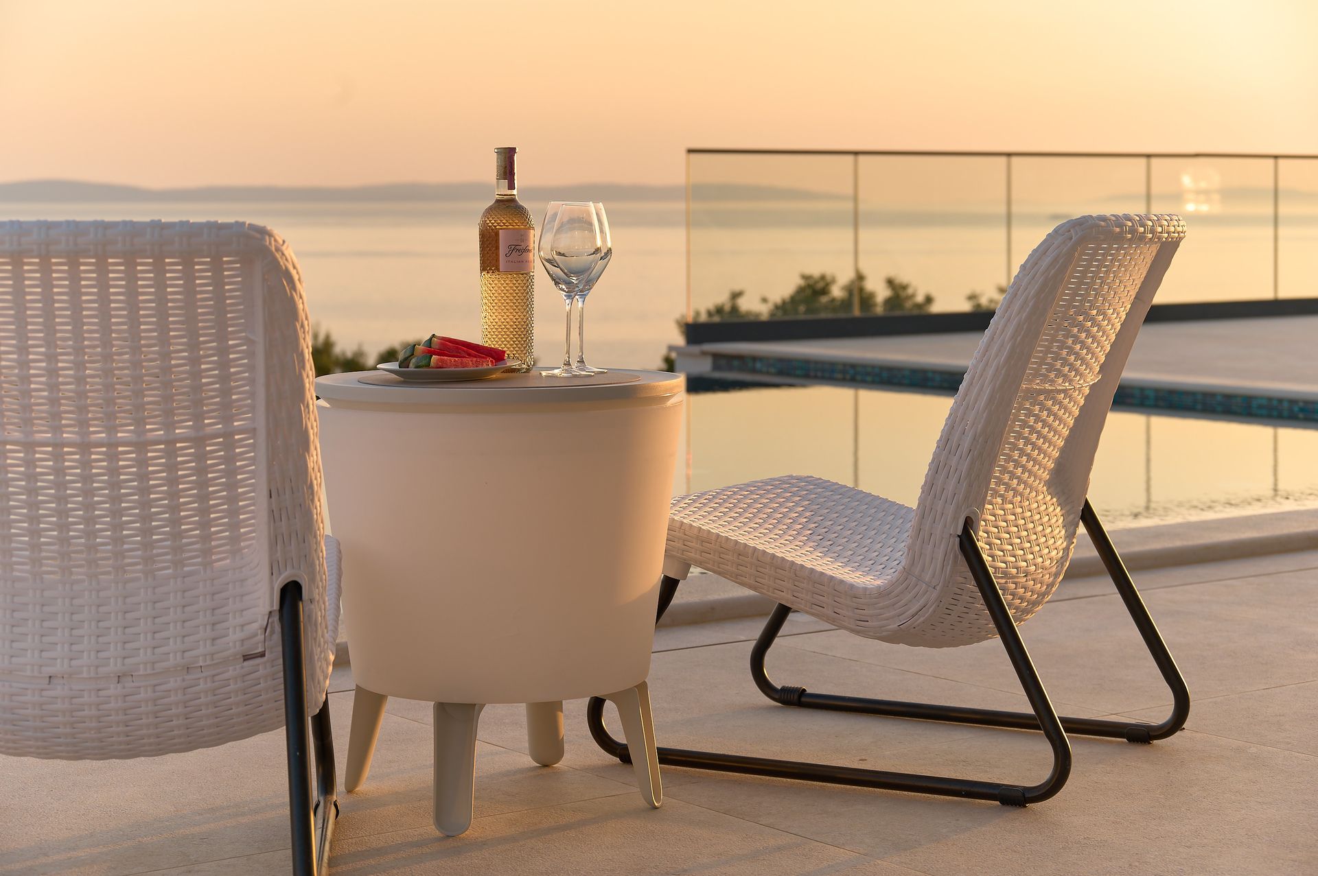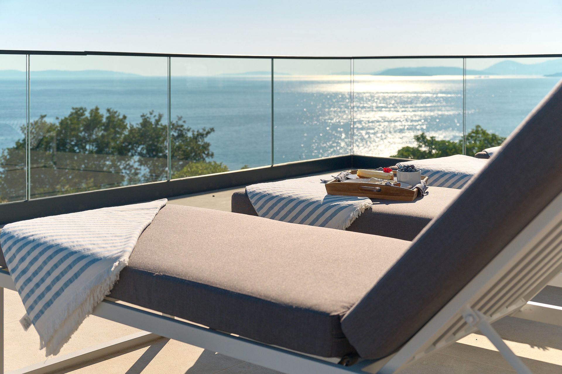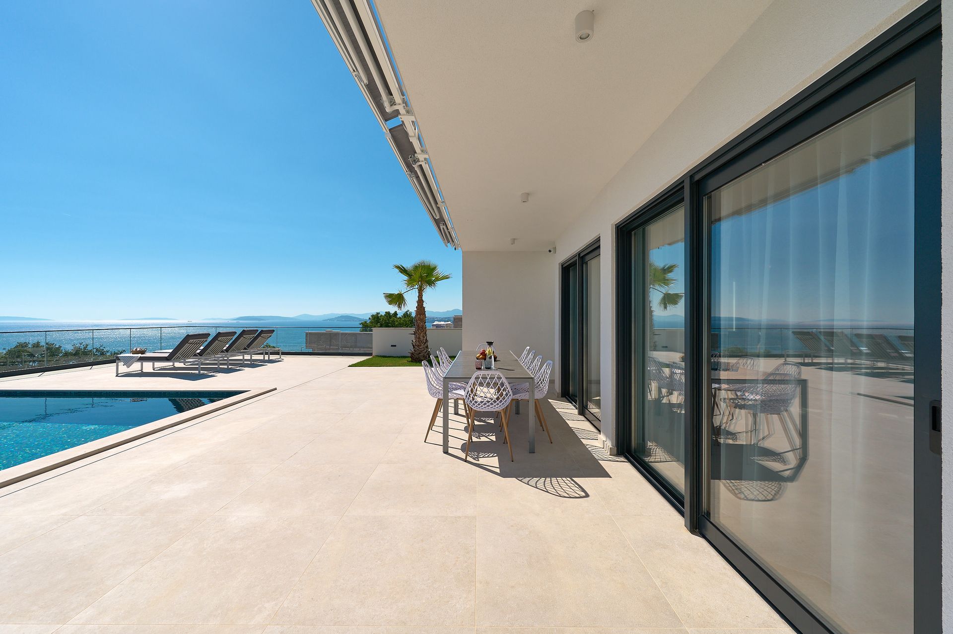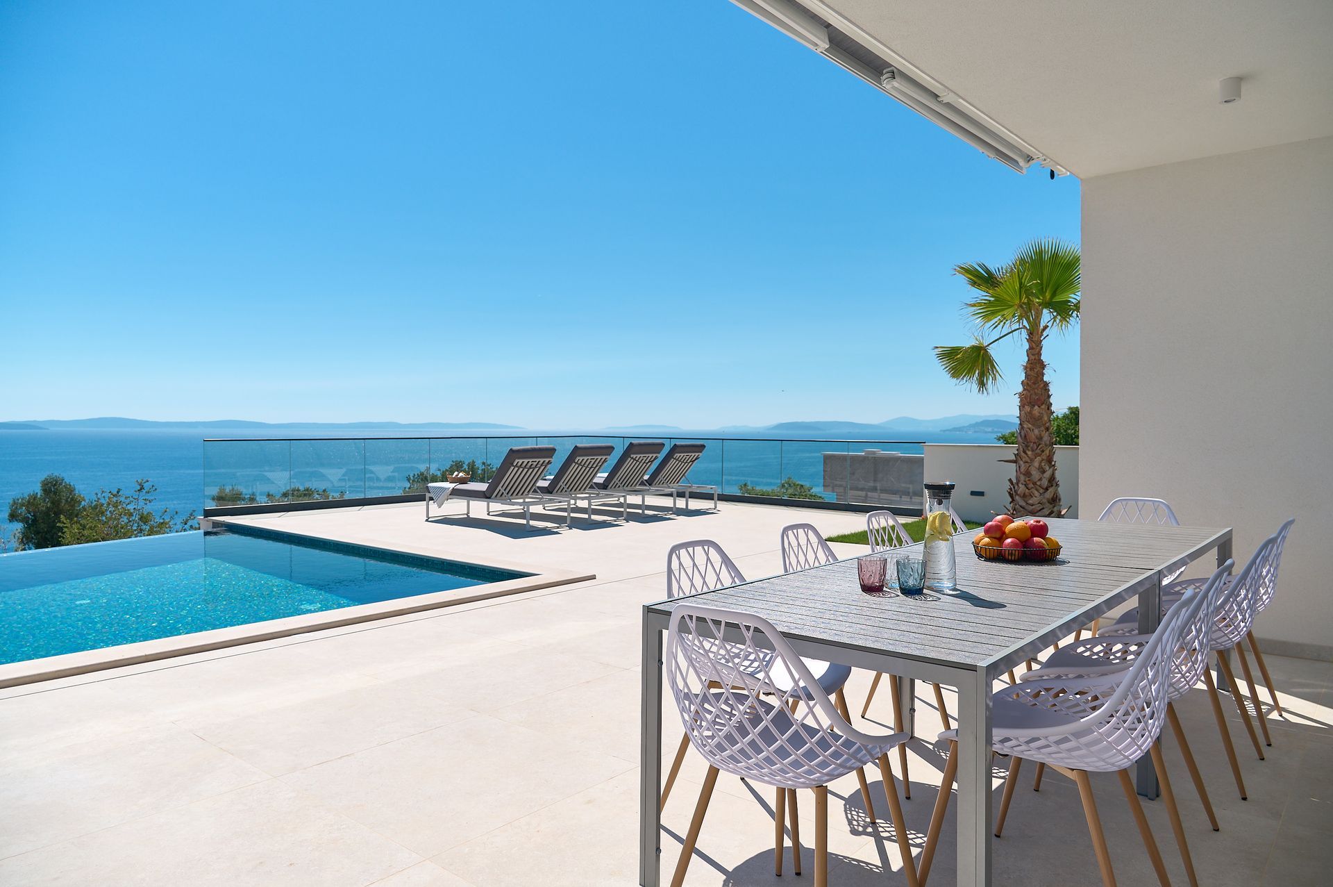 a patio with a view of the ocean and a couch and chairs .