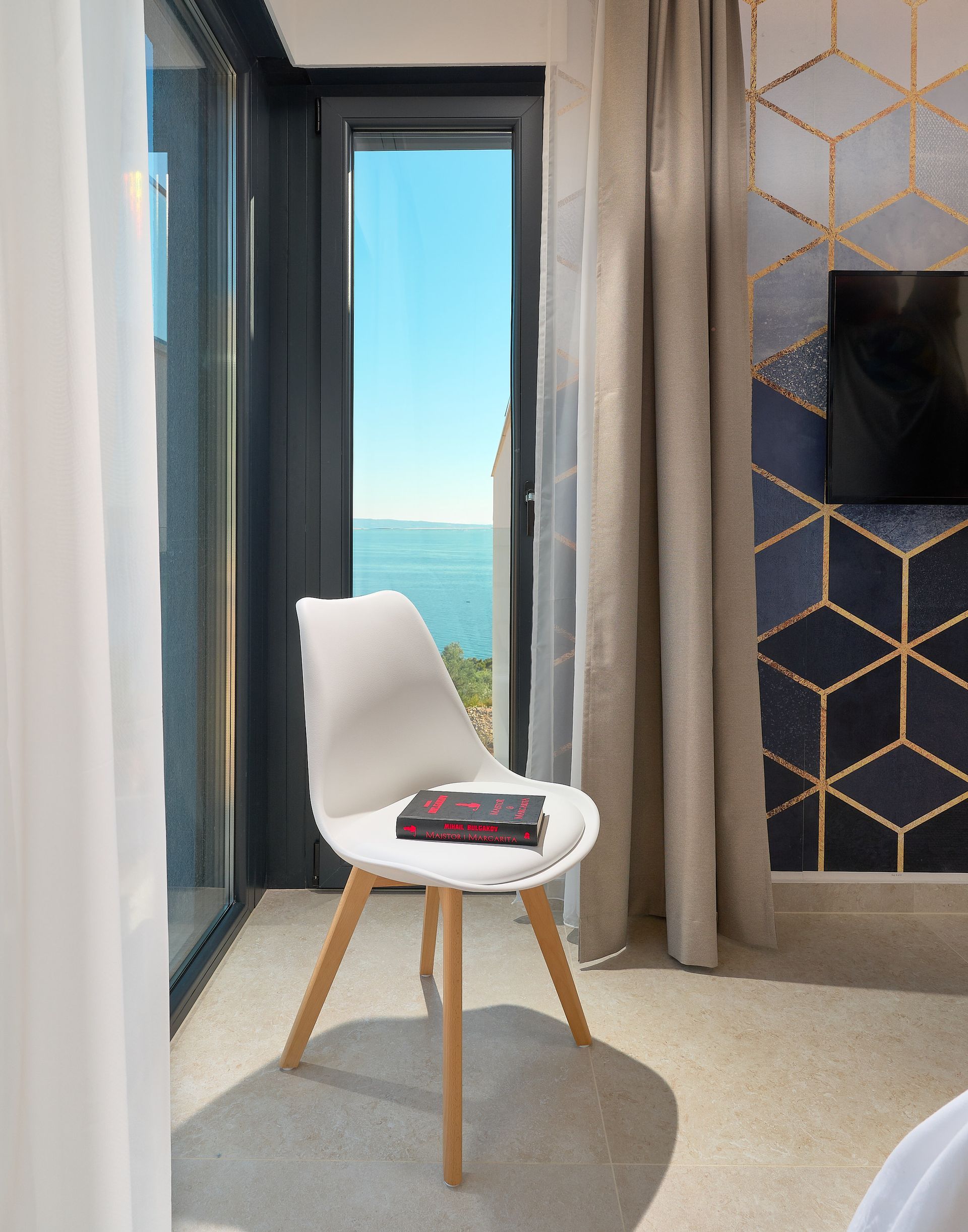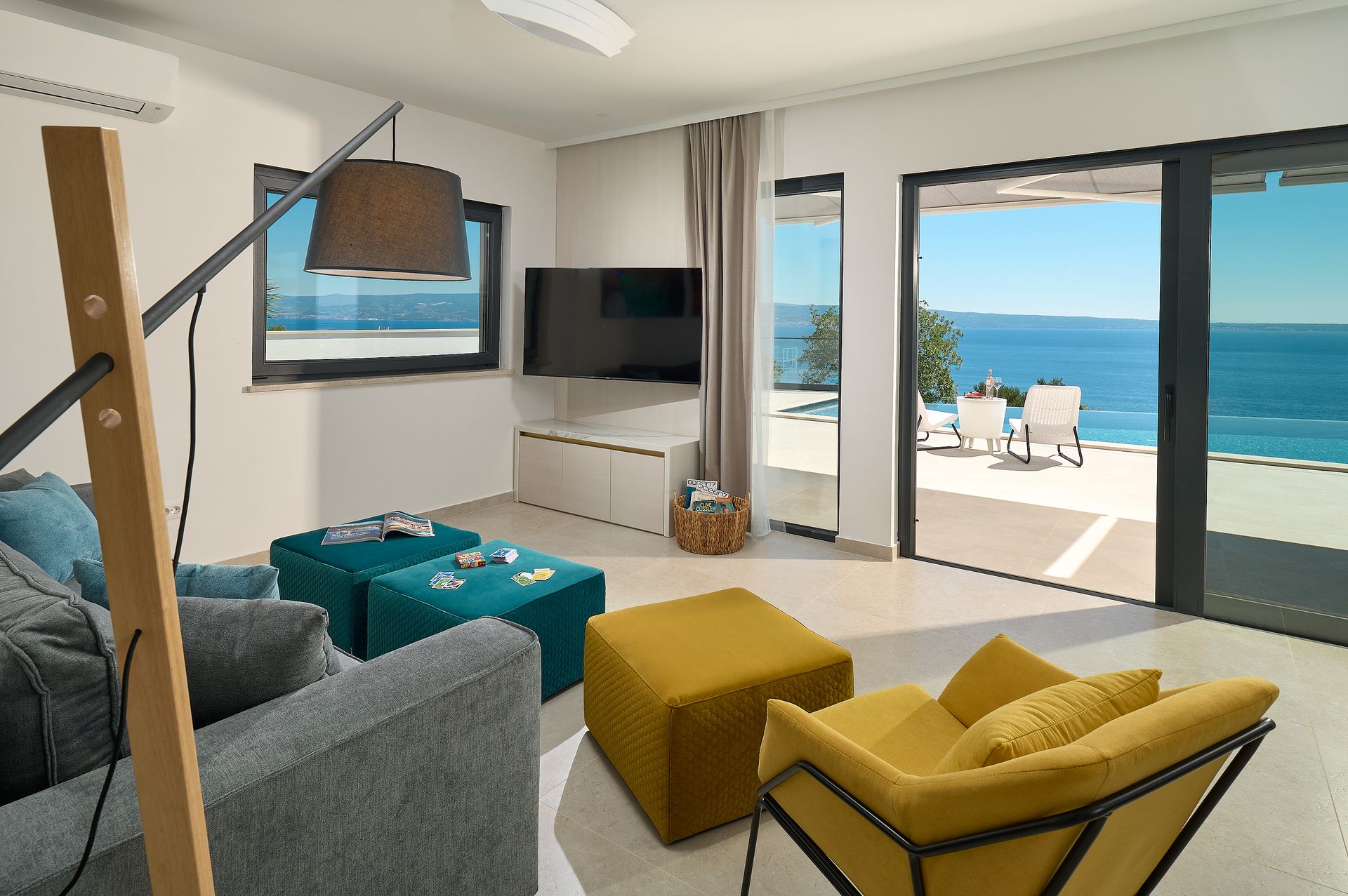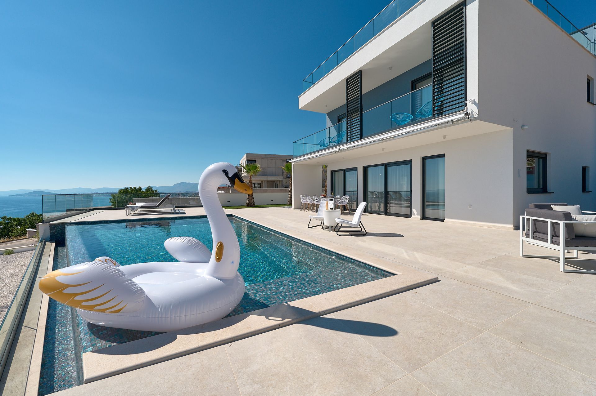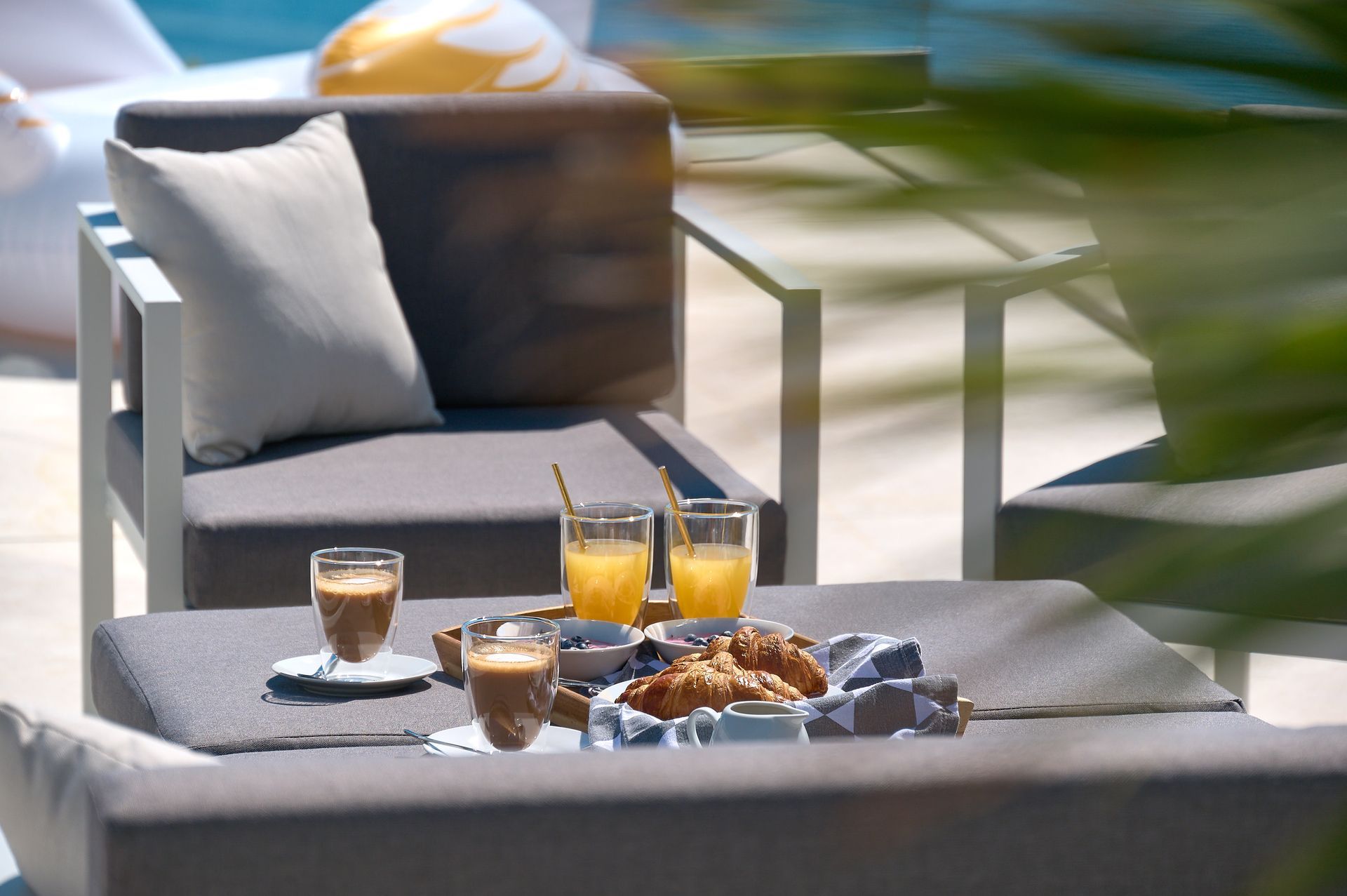 a patio with a view of the ocean and a couch and chairs .